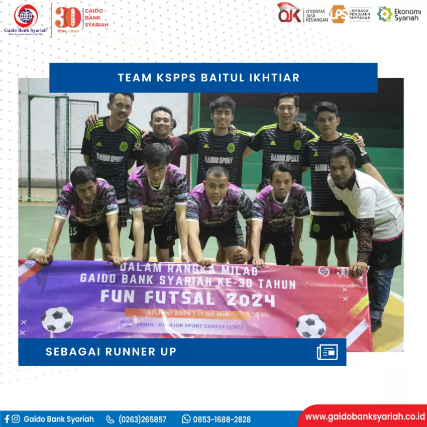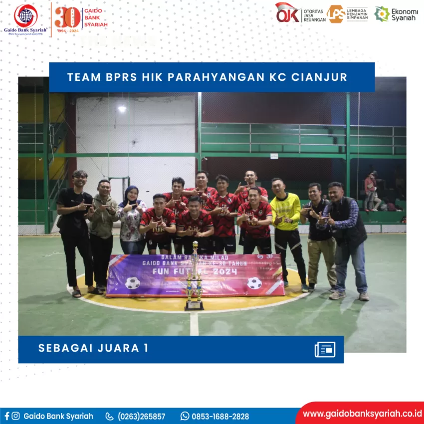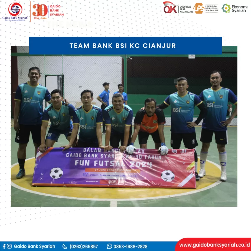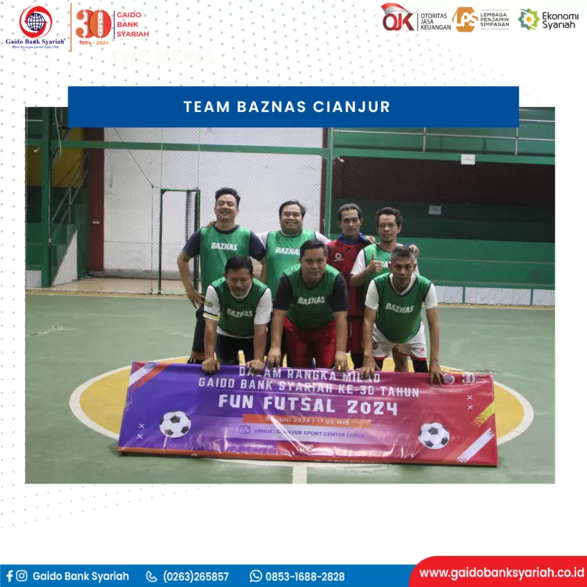 Acara Fun Futsal dalam rangka Milad Gaido Bank Syariah ke-30 diselenggarakan pada tanggal 7 Juni 2024, bertempat di Gor Futsal Cianjur Sport Center. Dengan antusiasme yang tinggi, acara tersebut diikuti oleh berbagai lembaga keuangan syariah ternama di wilayah Cianjur, antara lain Tim Futsal Gaido Bank Syariah, BPRS HIK Parahyangan, Bank Muamalat KC Cianjur, Bank BSI KC Cianjur, KSPPS Baytul Ikhtiar, dan Baznas Cianjur.